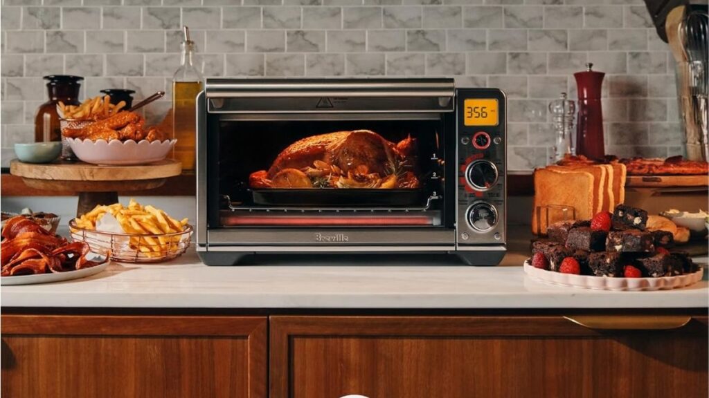 The Breville Smart Oven Air Fryer Compact combines air frying and convection baking in one elegant appliance. It includes 10 preset functions, smart temperature adjustment, and connectivity through Breville+.